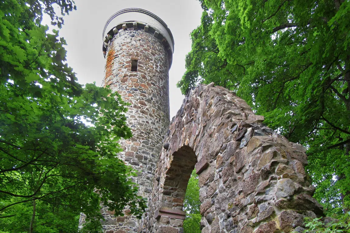 Název rozhledny pochází z německé výslovnosti někdejšího označení "Homolka". Je napsán na starých mapách pod názvem Vyhlídka Františka Josefa I. kamenná válcová věž je vysoká 20 metrů, na její vrchol vede 120 schodů. Za vhodných podmínek (zejména večer) je na rozhledně slyšet Zpívající fontána.
